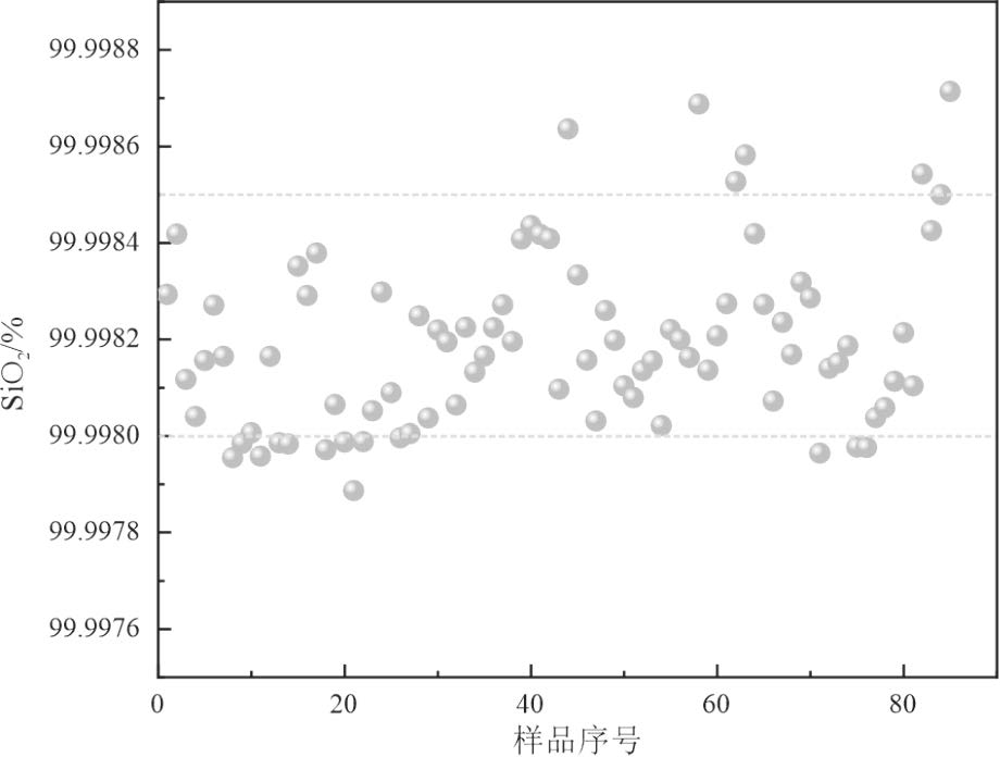 研究团队基于东秦岭古生代复合造山带的地质背景,重点聚焦灰池子、漂池等花岗岩体分布区,通过系统调查,在漂池岩体内分离出高分异花岗岩单元,其大地构造背景、岩石类型、矿物组成、地球化学特征与美国Spruce pine地区白岗岩型高纯石英矿具有较大的相似性。据此,研究团队判定其为白岗岩型高纯石英矿,并首次提出“白岗岩型高纯石英矿床”成因模型。通过开展原料精准识别-杂质高效去除联合攻关,在实验室成功制备出达到半导体用石英砂国际IOTA-CG标准的高纯石英砂,经工业试验验证,可稳定产出4N8级高纯石英砂,满足光伏坩埚内层砂需求,并具备拓展至半导体级应用的潜力。